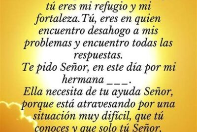 Hoy quiero dedicar una oración a mi hermana, para que Dios la bendiga con salud y bienestar. Ella es una persona maravillosa, llena de amor y bondad, y siempre está dispuesta a ayudar a los demás. Estoy muy agradecido por tenerla en mi vida y quiero que sepa que la quiero mucho. Por eso, le pido a Dios que la proteja y la cuide siempre. Que la llene de energía y salud para que pueda disfrutar de la vida al máximo. Que la guíe y la acompañe en todos sus pasos. Que la llene de paz y felicidad. Amén.